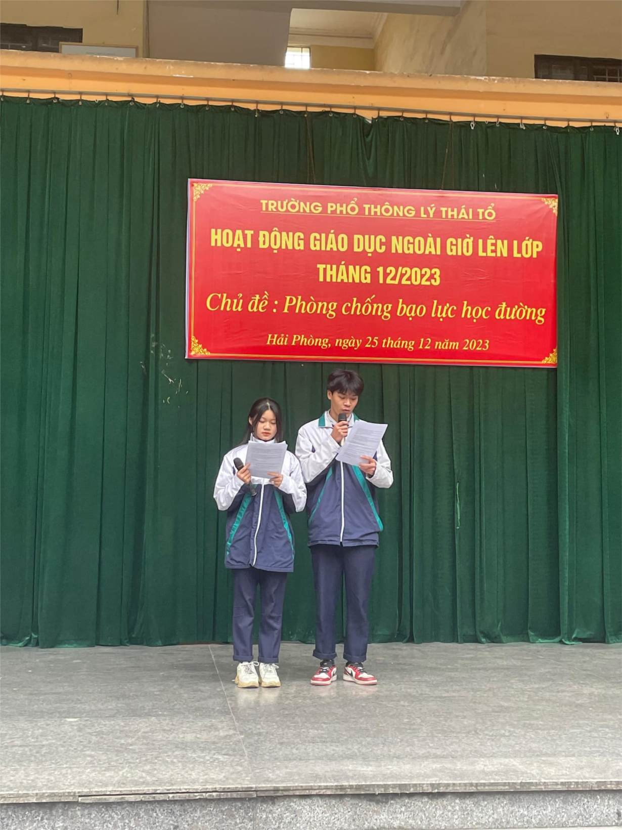 Sáng ngày 25/12/2023 Nhà trường tổ chức tiết hoạt động ngoài giờ lên lớp với chủ đề “Xây dựng tình bạn đẹp, phòng chống bạo lực học đường” do các em học sinh khối 12 thực hiện.