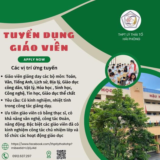 Để chuẩn bị cho năm học 2024 - 2025 Trường phổ thông Lý Thái Tổ Thông báo tuyển giáo viên THPT các môn: Ngữ văn, Toán, Tiếng Anh, Thể dục, Vật Lý, Hoá Học, Địa Lý, Lịch Sử, Kinh tế pháp luật, Tin học.